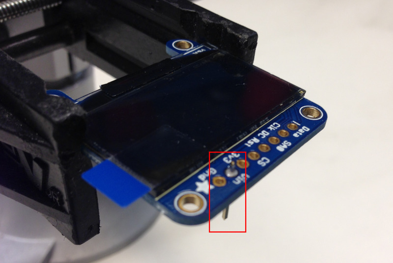 Ultimately you will solder the two boards with a header pin lining up V on the Huzzah and Vin on the 1.3" OLED. This way all the boards will stack up nicely. Make the other wire connections before soldering the two together however, since it will make the process easier. I've found that thin-gauge, wrapping style wire works best.