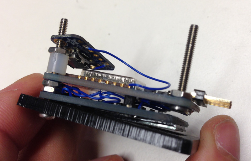 Start by putting a 1" screw through the top left hole (if the screen is facing you). This screw will go through all three breakout boards, lining them all up! Start by putting two hex nuts between the the OLED breakout and the Huzzah breakout and putting the screw all the way through. Don't overtighten though!