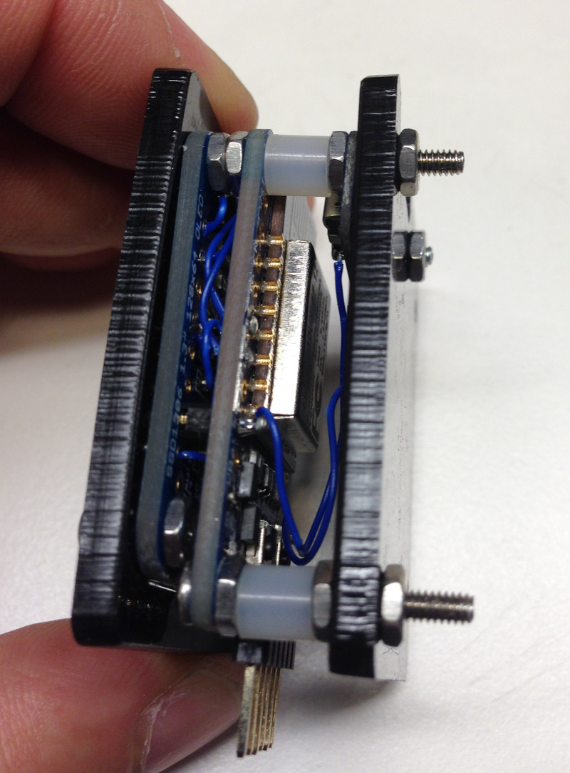 Attach the microUSB breakout to the other piece of lasercut acrylic. Use a 1/4" screw and hex nut to fix the left hole of the breakout to the acrylic on the side with the cutout notch. The cutout notch is there to allow a microUSB cable to connect.