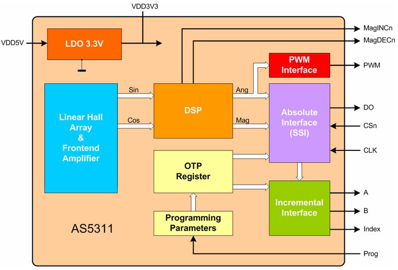 A multi-pole magnetic strip or ring, with a pole length of 1 mm, is required to sense the rotational or linear motion. The magnetic strip is placed above the IC at a distance of typically 0.3 mm. The absolute measurement provides instant indication of the magnet position within one pole pair, with a resolution of 488 nm per step (12-bit over 2 mm). This digital data is available as a serial bit streamed as a PWM signal. Furthermore, an incremental output is available with a resolution of 1.95 μm per step. An index pulse is generated once for every pole pair (once per 2 mm).The travelling speed in incremental mode is up to 650 mm/second. An internal voltage regulator allows the AS5311 to operate at either 3.3 V or 5 V supplies. Depending on the application, the AS5311 accepts multi-pole strip magnets as well as multi-pole ring magnets, both radial and axial magnetize.