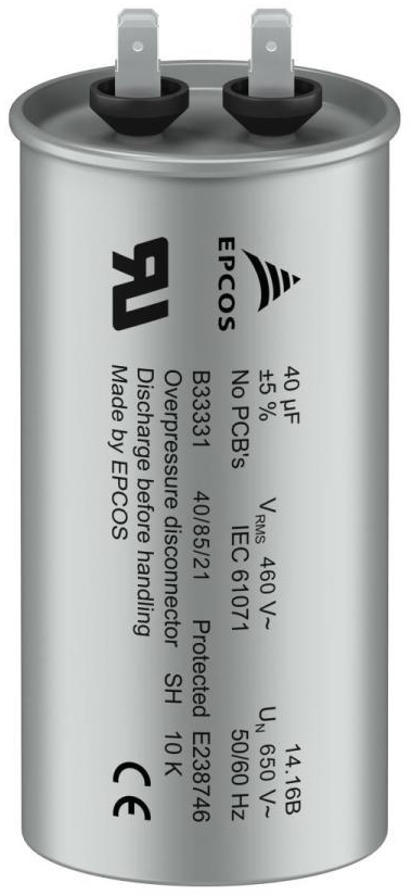 The components of the TDK EPCOS B33331V series MKP AC capacitors are designed for a rated voltage of 460 VRMS, corresponding to a peak voltage of 650 V, and cover a capacitance range from 2 µF to 50 µF. Both the cans and the tops are constructed of aluminum, making the overall design particularly robust. Despite this, the dimensions range from just 30 mm x 55 mm to 50 mm x 100 mm (D x H), depending on the type.