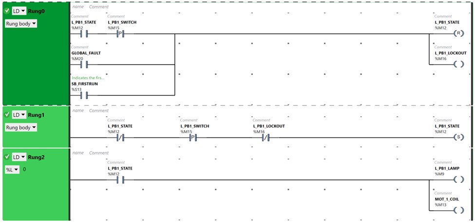 Ladder Diagram, also known as Ladder Logic or Relay logic is a widely used graphical programming language that mimics the original relay logic and wiring diagrams that were used in process control before PLC devices were developed. Great for simple on/off interfaces, logic control, and safety interlocks, LD is still favored in modern PLC programming as it easy to get started with and logically consistent with each rung of the ladder detailing the input and control devices as read from top to bottom and left to right.