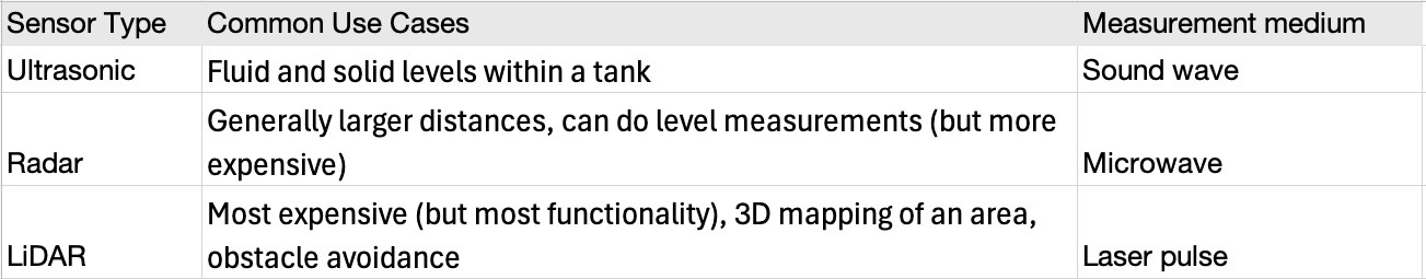 - Ultrasonics: A transmitter emits a short burst of high-frequency sound waves. When this pulse of sound hits an object, some of the sound waves are reflected to the receiver. A common application for ultrasonic sensors is contactless liquid and fluid level measurement within a tank.