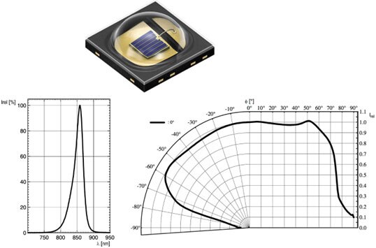 Devices from the OSLON Black series, such as the SFH 4716B (Figure 3, top), are cost-effective, high-performance IR emitters. The SFH 4716B has a peak wavelength of 850 nm (Figure 3, bottom left). The series also includes devices at 920 and 940 nm and combines exceptionally high total optical flux and small industry-standard packages with a footprint of 3.75 × 3.75 mm.