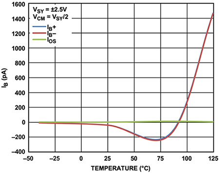 圖 1:MAX74810ARMZ-RL 的 IB 對溫度關係圖;這些圖表對於執行精密 AFE 的設計人員來說非常重要。(圖片來源:Analog Devices)