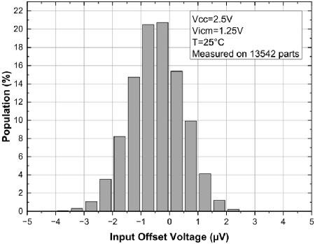 運算放大器規格書通常會描繪出輸入偏移電壓 (VIO) 在數千個受測裝置中的分配狀況。這些圖表,例如 TSZ901IYLT 的圖表 (圖 2),能向使用者保證廠商已妥善控制生產流程,讓模擬更加完善,因此得以放心。