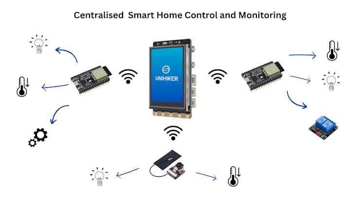 The UNIHIKER, equipped with a touchscreen display, runs a Python-based graphical user interface that allows users to monitor and control various aspects of their home environment. Each room is outfitted with an ESP32 that connects to sensors (such as temperature and humidity) and controls appliances (like lights, fans, or heating systems).