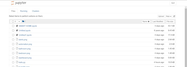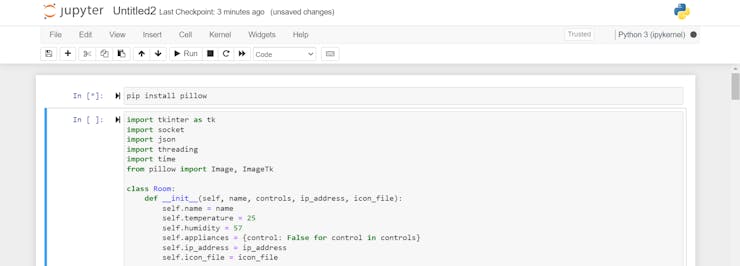 In the Jupyter Notebook interface, click on "New" and select "Python 3". In the new notebook, copy and paste the entire Smart Home Dashboard code we developed earlier. Save the notebook with a name like "SmartHomeDashboard.ipynb".