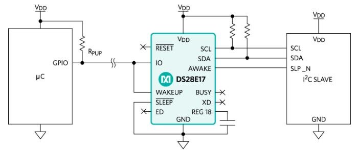 Analog Devices 的 DS28E17 是 1-Wire 從屬至 I²C 主要橋接器元件